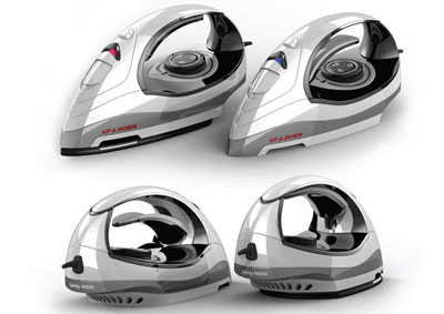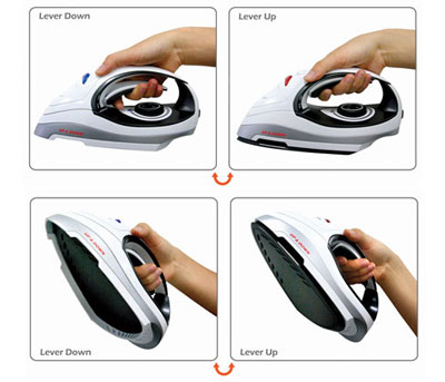 در این ایده قسمت داغ و فلزی اتو در داخل یک حفره قرار می گیرد و با سطوح خارجی اتصالی ندارد و یک اهرم در زیر قسمت دست شما قرار گرفته که با پایین نگه داشتن آن قسمت فلزی و داغ اتو بیرون می آید و می توانید اتوکشی کنید .